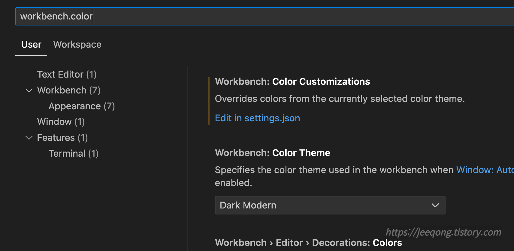 - Wrokbench.color 에서 Edit in settings json 클릭해도 됨