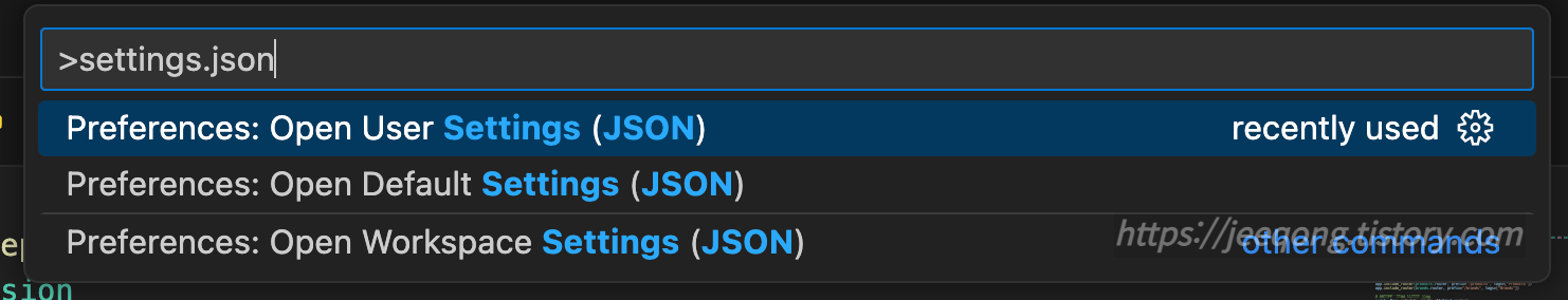 - Command + Shift + P에서 settings.json 검색
