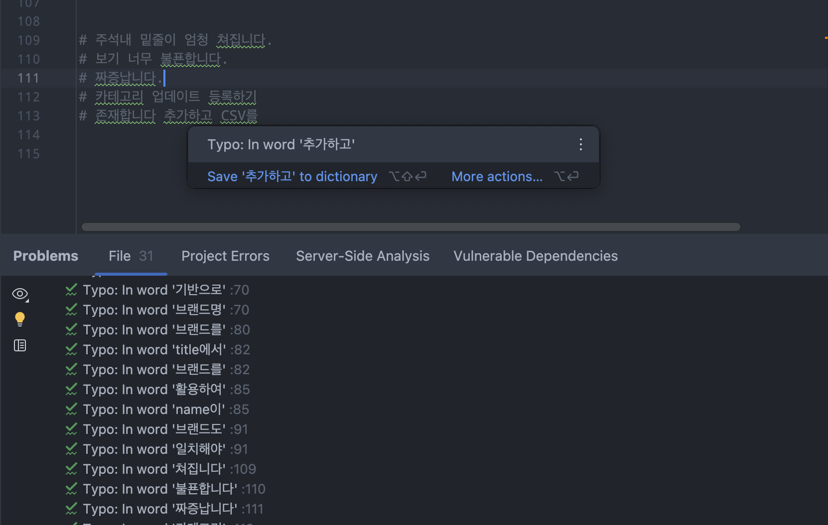 [Pycharm] 파이참 + 주석 + Spelling Typo 체크 설정 해제하기