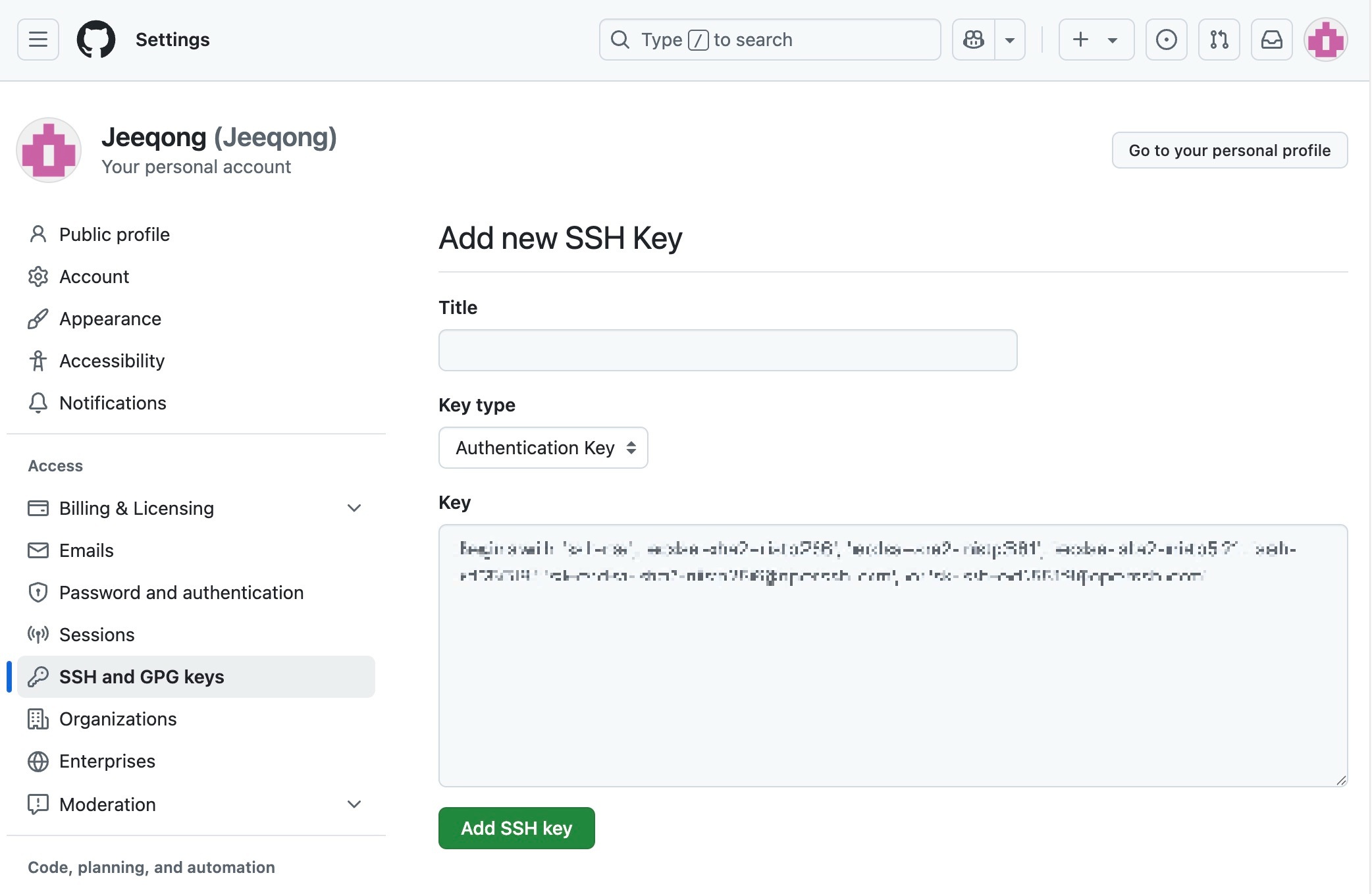 - GitHub → Settings → SSH and GPG keys → New SSH key → 이름 적당히 붙이고 붙여 넣기