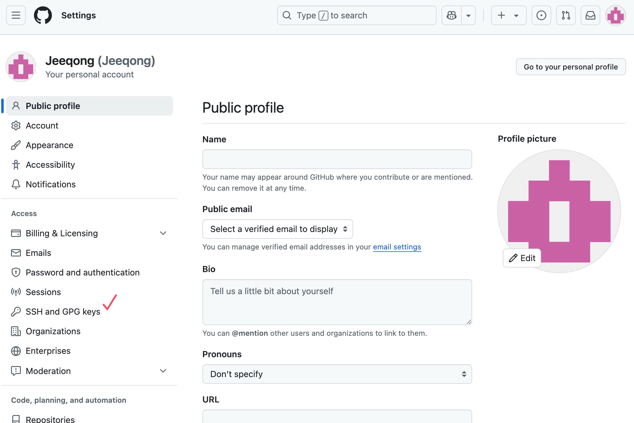 - 링크로 접속하고 바로 로그인해도 됨 https://github.com/settings/keys