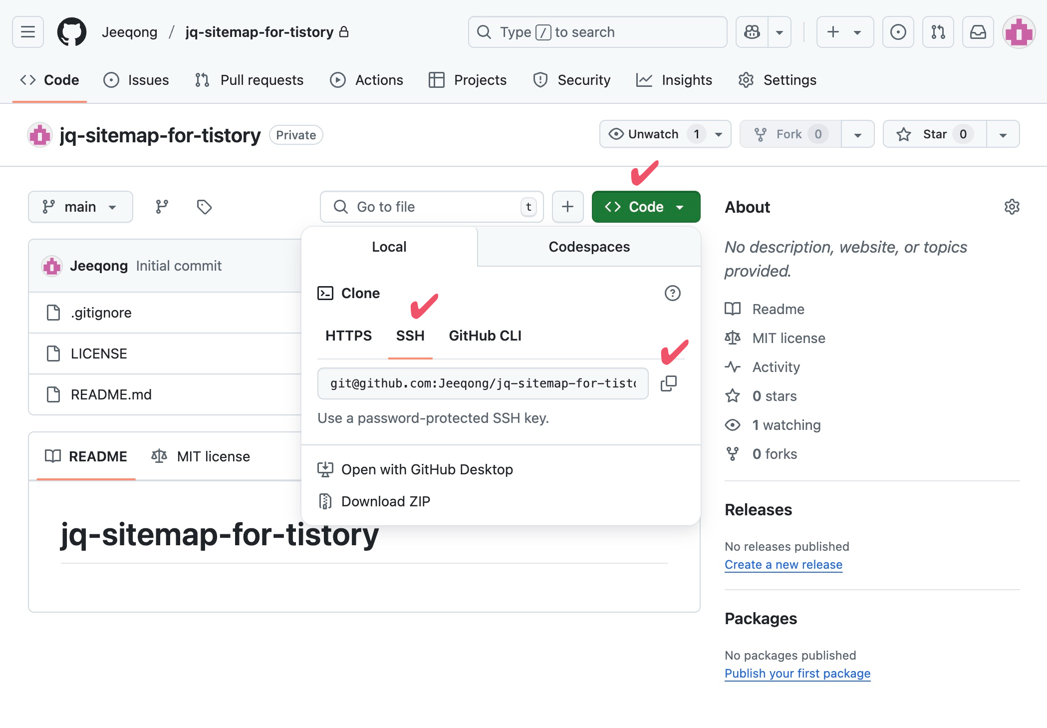 7. 리포지토리 주소 복사 및 변경 (https → ssh)