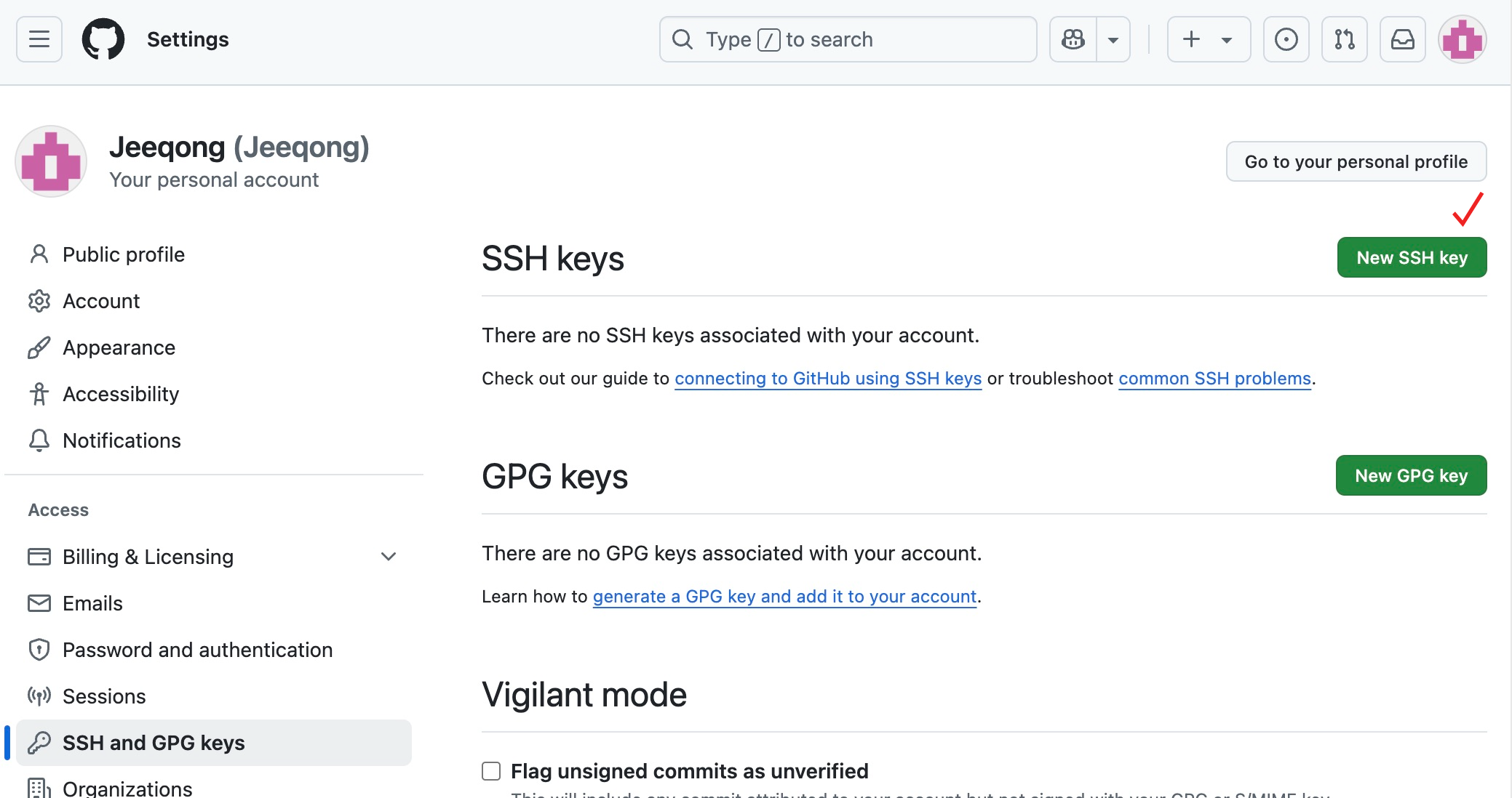 5.3 GitHub → Settings → SSH and GPG keys → New SSH key 버튼클릭