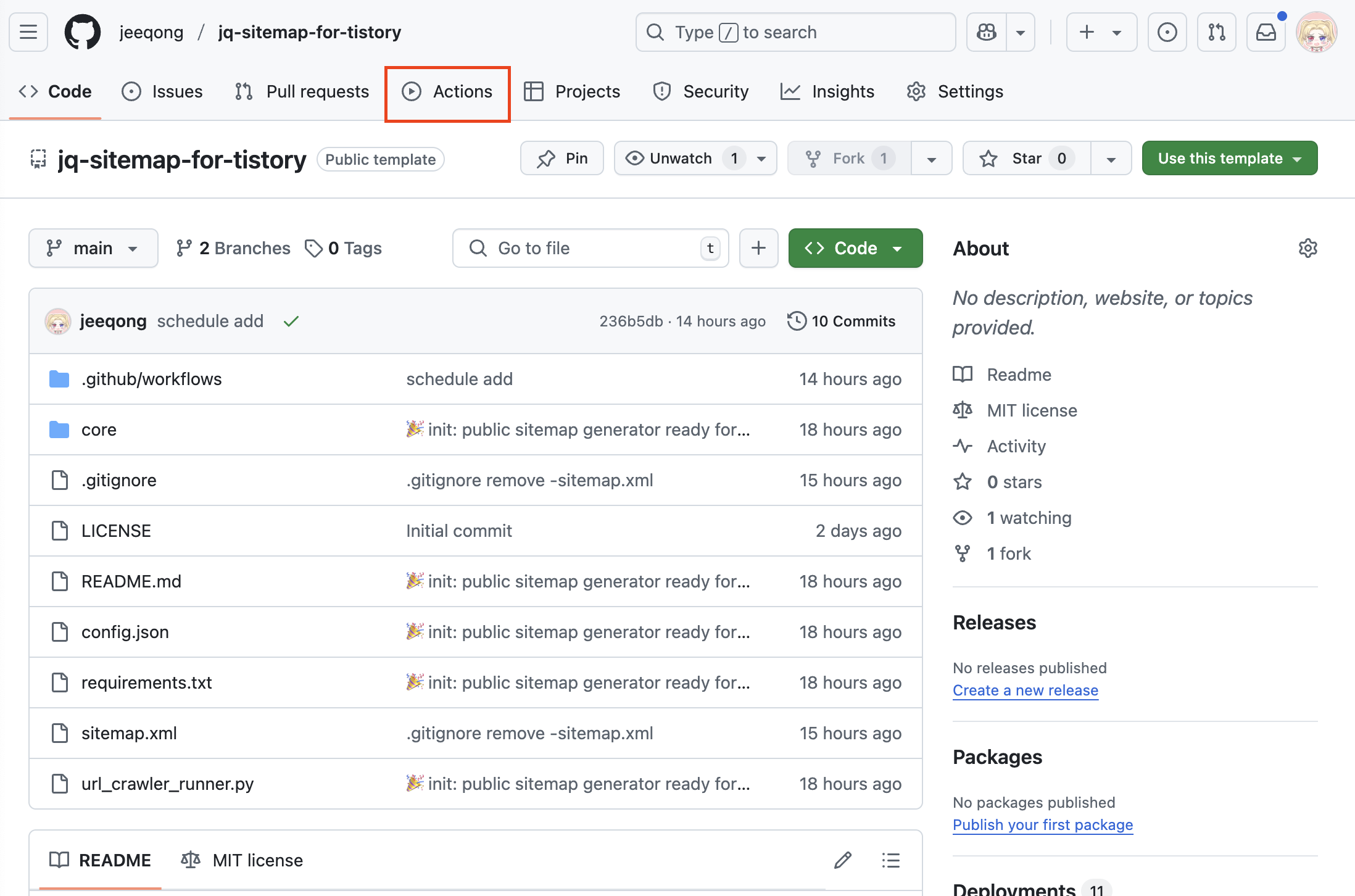 - github 접속 > https://github.com/ > jq-sitemap-for-tistory 레포 클릭