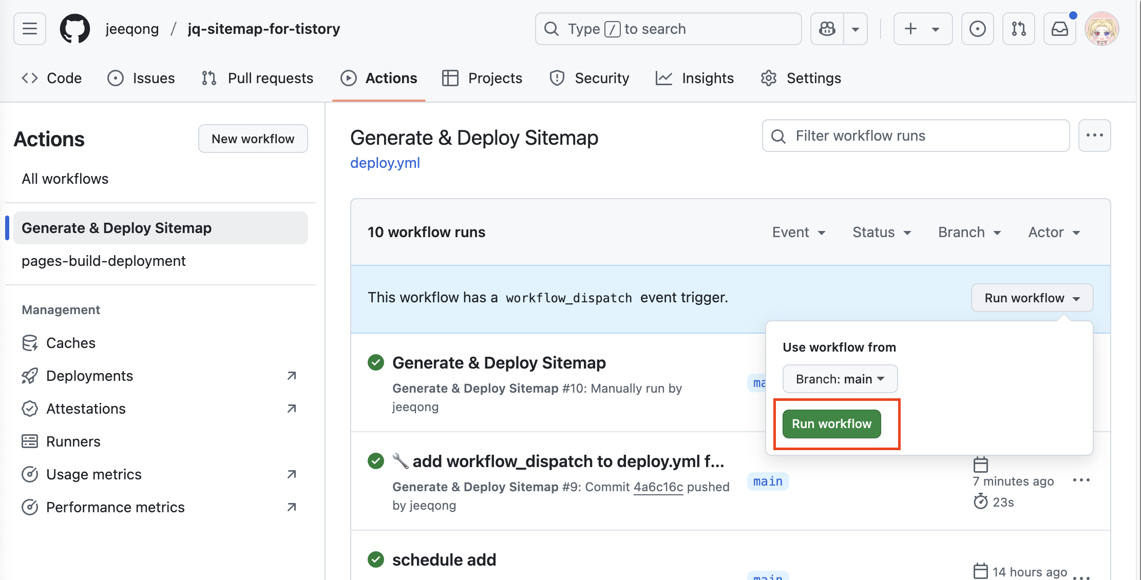 - 워크플로우 목록에서 Generate & Deploy Sitemap 클릭