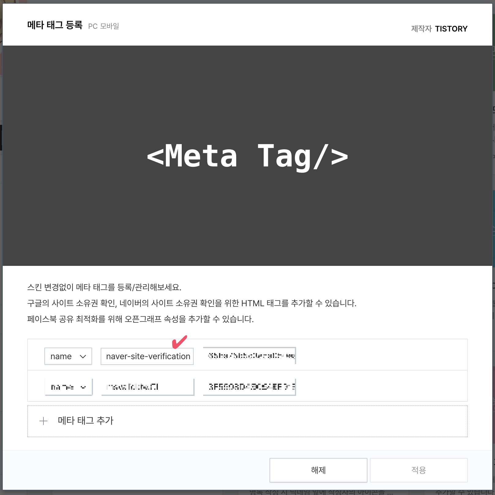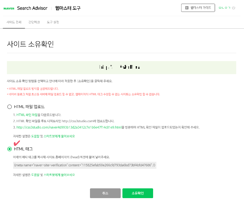 - 두 번째 인풋박스에 네이버 사이트소유 메타태그에 있던 comtent="xxxxxx" 부분을 복사