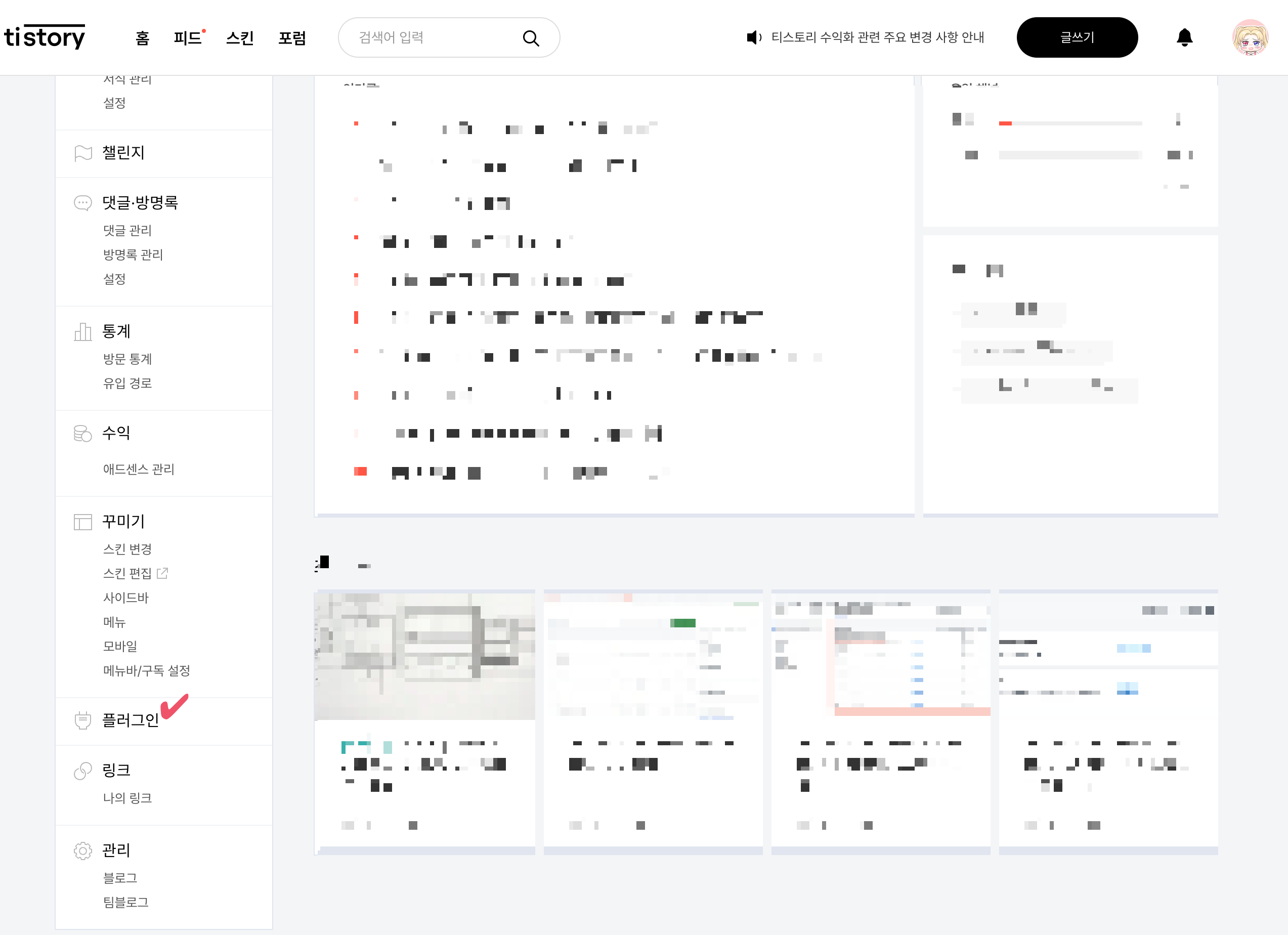 - 새창을 열어 티스토리 관리자 → 꾸미기 → 플러그인 클릭