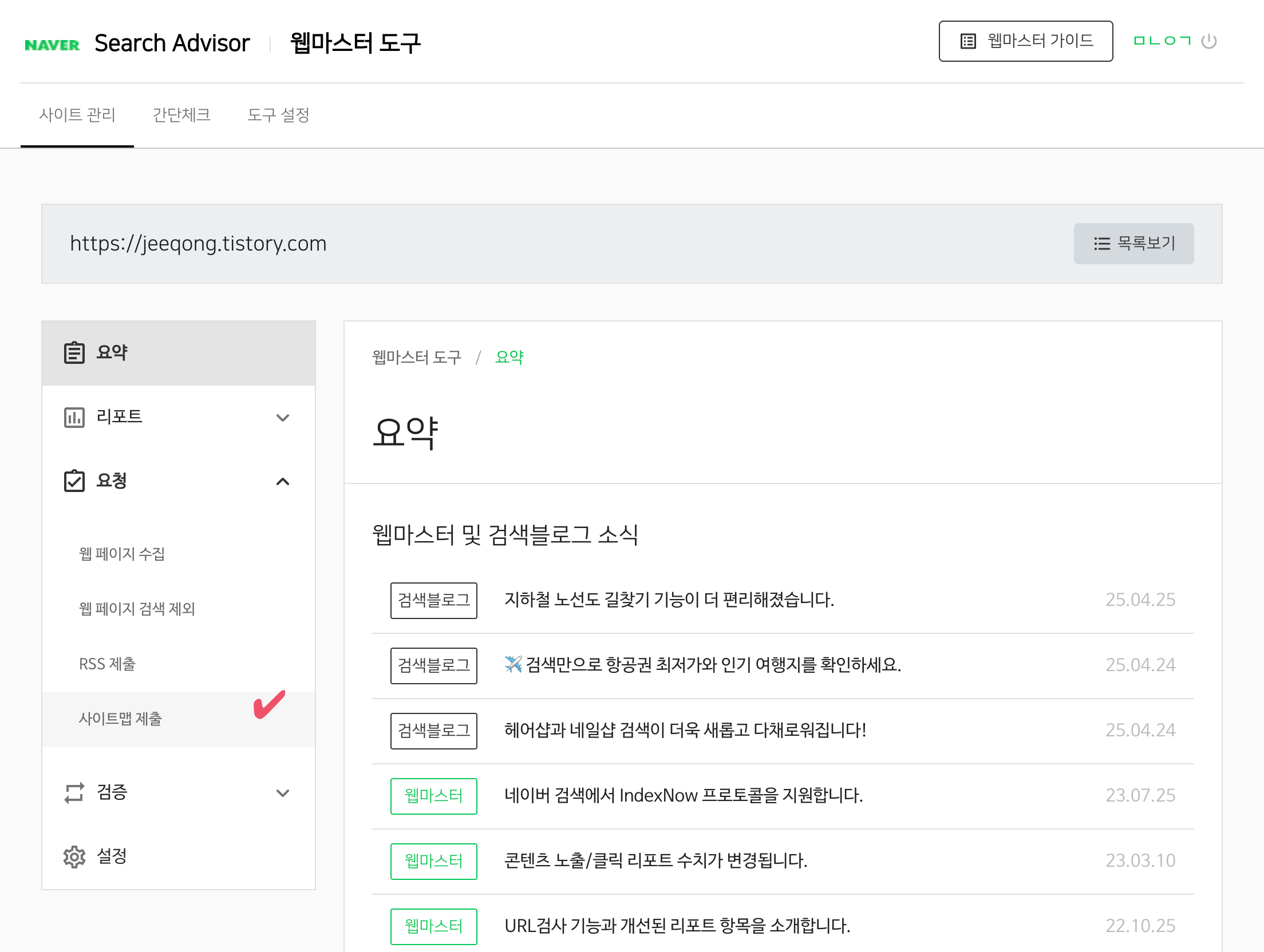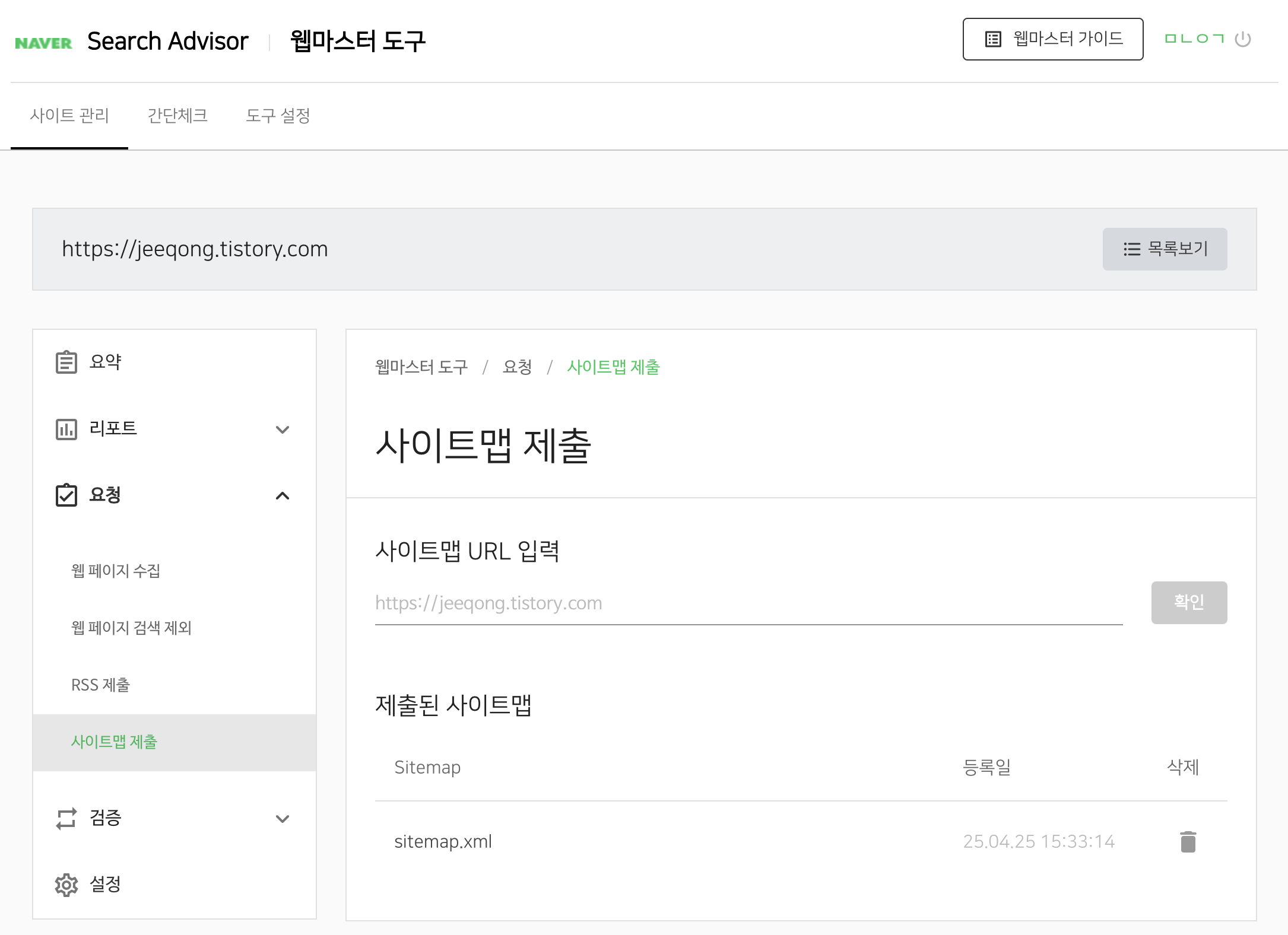 - 서치 어드바이저 좌측 메뉴에서 요청->사이트맵 제출 클릭